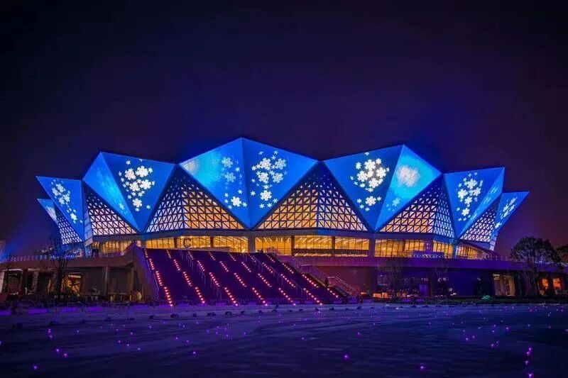 西安奥体中心主体育场由先进且环保的清水混凝土浇筑的数十根大型V柱撑起了绽放中的“石榴花”,将西安市市花石榴花应用于主体育场的造型,寓意“丝路启航,盛世之花”。